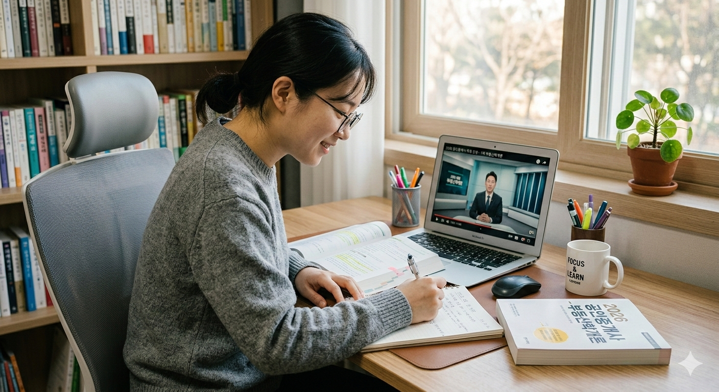 교재 준비: 강의는 무료라도 기본서와 문제집은 최신 개정판으로 구비하는 것이 좋습니다. (지자체 포털 내 강의 상세정보에서 사용하는 교재 확인 가능)